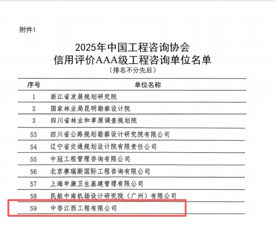 近日,中国工程咨询协会发布了“2025年工程咨询单位信用评价结果”,公司凭借过硬的综合实力成功荣获AAA级信用评价等级,为公司发展增添新荣誉。